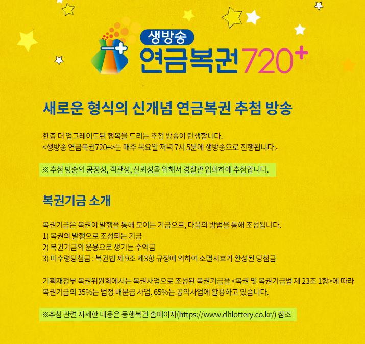 연금복권 720+는 국내 최초이자 국내 유일의 연금식 복권이라고 합니다. 2020년 5월에 출시됐으며 정규적인 생활을 보장해서 마련된 것이고요. 당첨확률은 로또 복권 6/45보다 약 1.6배 높은 1/5,000,000이라고 합니다.