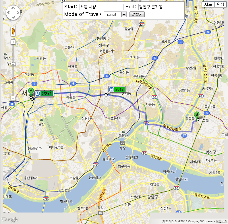 출발지와 도착지를 검색해서 경로를 선택하게되면 시간대를 간택해서 출발할 수 있어요. 메인화면에 보이는 전체길안내를 보고 왼편에 나오는 세세한 상세내역으로 어떻게 가야할지 미리 점검해볼 수 있어요. 거리와 시간이 나오니 얼마나 걸리는지 가늠이 되고 어떻게 갈지 선택을 할수도 있다고 합니다.