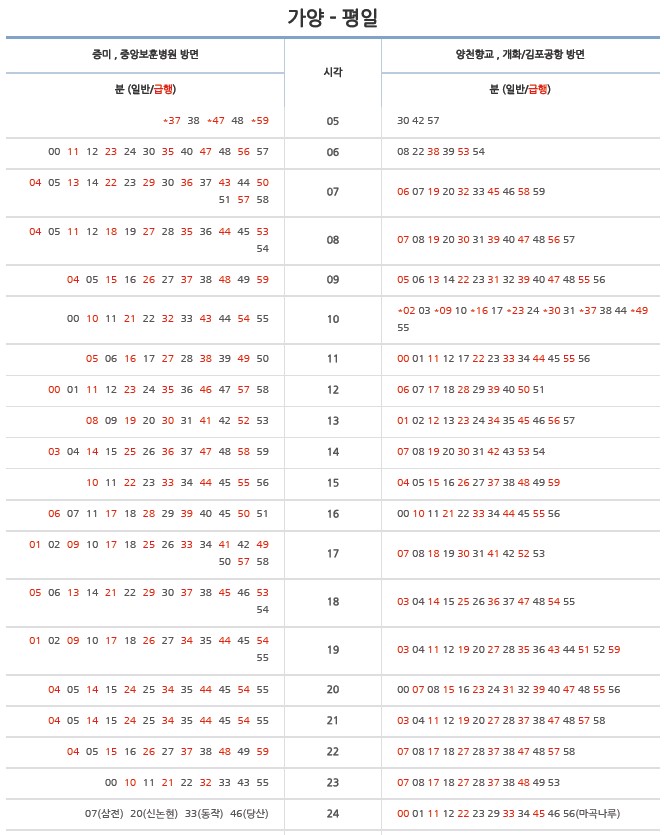 특정 구간은 급행이라고 하여 대개 역에 정차하는 것이 아니고 특정한 몇개의 역만 지나고 빠르게 이동할 수 있는 게 있다고 합니다. 그 중에서 많은 분들이 활용하고 있는 수도권 지하철 9호선 급행 노선 시간표와 정차역을 한번 볼게요.