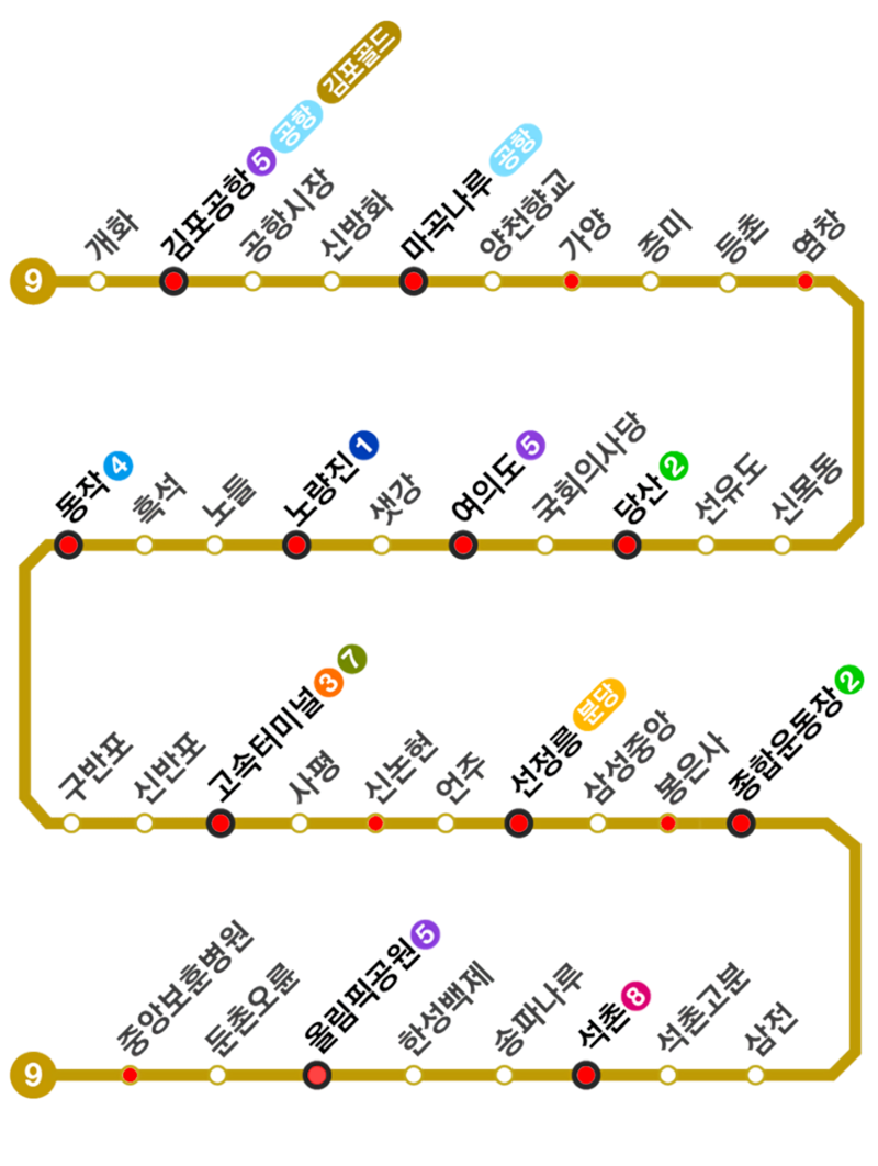 9호선은 영등포, 강서, 양천 지역의 강남권 이동 시간을 단축해주고, 올림픽대로의 교통체증 완충 요지로 추진되었어요. 2009년 07월 1단계 구간 개통을 난생 처음 으로 2018년 3단계 구간이 개통되며 개화역에서 보훈중앙병원역까지 총 38개 역을 관통하는 노선이 완성되었어요. 그 중 급행 정차역은 총 16개 역으로 김포공항, 여의도, 노량진, 고속터미널, 신논현, 통합운동장 등 통행량이 많은 주요역에서 정차하고 있어요.