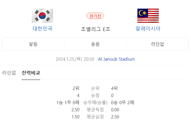 2023 카타르 아시안컵 조별리그 E조 두번째경기까지 마쳤습니다. 우리나라는 1승 1무로 요르단과 동률이지만 골득실에서 2위를 지키고 있습니다. 이제 곧 E조 최종전이 열리게 되는데요.
