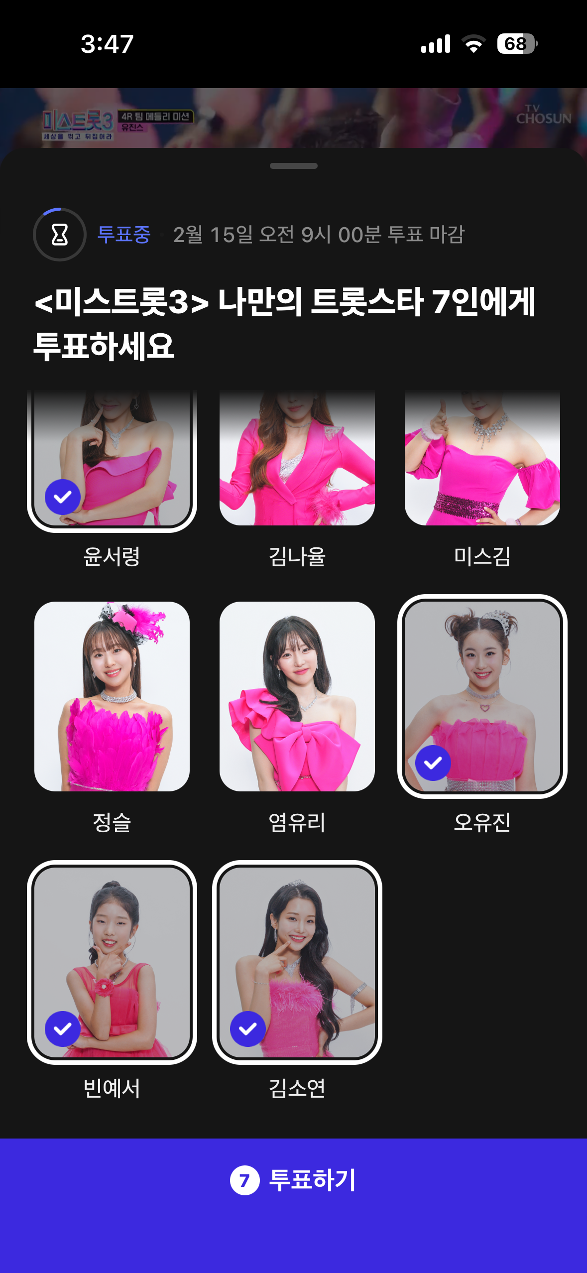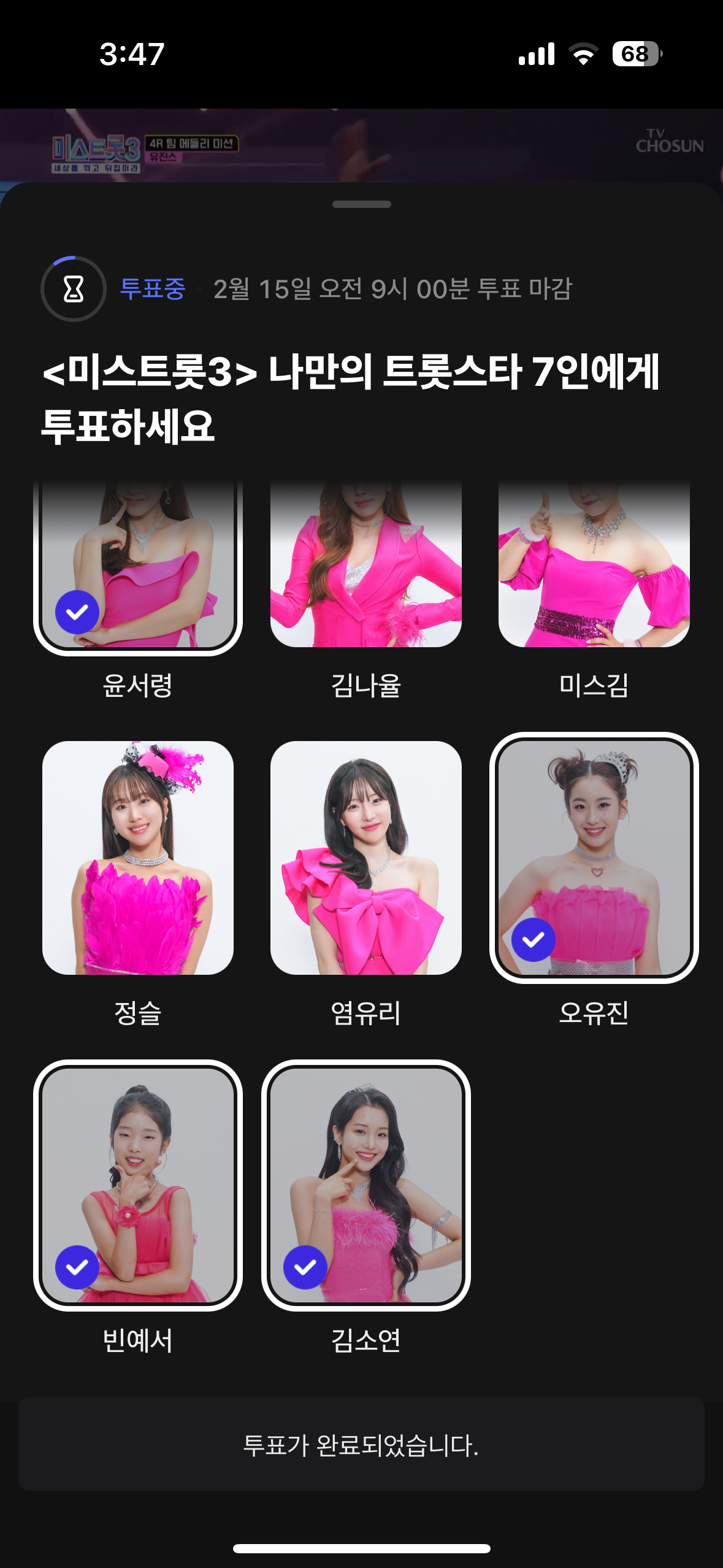 매 방송이 끝날 때마다 대국민 응원 투표가 진행되고, 현재 미스트롯3 대국민 응원 투표가 5주차까지 마무리되고, 6주차 응원 투표가 진행중입니다.